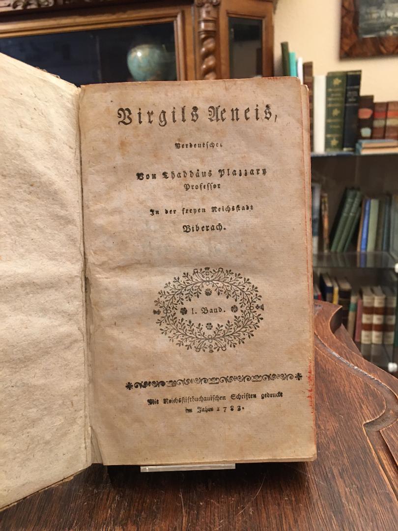 Vergil / Vergilius Maro, Publius. – Plazzary, Thaddäus (Üb): Vergil – Aeneis : Verdeutschet von Thaddäus Plazzary, Professor in der freyen Reichsstadt Biberach. 2 Bände in 1 (alles). Buchau, Mit Reichsstiftbuchauischen Schriften gedruckt, 1783. 8° (20x12), 1 Bl., 244 S., 1 Bl., 256 S., schlichter HPgmt d.Zt., Kanten bestossen, gutes Exemplar, fest und sauber, [Zur Übers. vgl. GV 150, 307].– Erste Ausgabe dieser vollständigen Übersetzung der Aeneis des Vergil durch Thaddäus Plazzary 1746-1789), der Professor in Biberach war und dort 1775 den Vorläufer des heutigen Wieland-Gymnasium gegründet hatte.– Im Gegensatz zur Ausgabe von 1790 noch ohne Kupfer.– Druck aus dem Reichsstift [Bad] Buchau.–