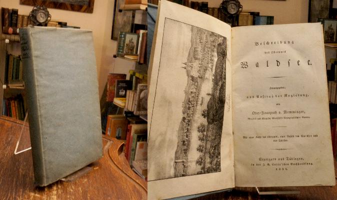 Waldsee, Oberamt. – Memminger, [Johann Daniel Georg von]: Beschreibung des Oberamts Waldsee. Herausgegeben aus Auftrag der Regierung. Stuttgart-Tübingen, Verlag der Cotta’schen Buchhandlung, 1834. 8° (20x13), 228, (4) S., mit einer Karte des Oberamts, einer Ansicht von Waldsee (lith von Keller) und vier Tabellen (so komplett), Pbd d.Zt., Papierumschlag mit handschriftl RTitel, Name auf Vorsatz, Karte in der obEcke mit alt unterlegtem Einriß, ordentliches Exemplar mit geringen Gebrauchsspuren, [Heyd II 6483].–