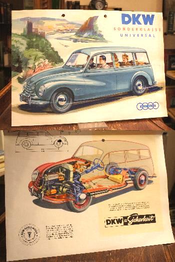DKW. – Prospekt / Datenblatt DKW Sonderklasse Universal (DKW 3=6 34 PS]) : (WB 1677 200 C 110 XIII). Auto Union, Ingolstadt-Düsseldorf. Graph. Gestaltung: Herbert Schlenzig. Ingoldstadt-Düsseldorf, Auto Union, [1954/55]. 4°quer (21x30 ausgefaltet: 42x60), mehrfach gefalteter Prospekt mit Illustrationen, Riß– und Detailzeichnungen, techn. Tab., ill OKart (Brosch), minimaler Staubrand, HändlerStempel, gelocht, gutes Exemplar,