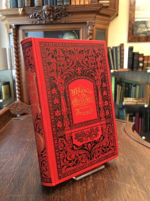 Uhland, Ludwig (1787-1862). – Uhlands Gedichte und Dramen in zwei Bänden. 2 Bände in 1 Buch (so komplett), Stuttgart, Verlag der J.G. Cotta’schen Buchhandlung Nachf, [1892]. 8° (18x12), 312, 342 S., roter Oln (Kaliko) mit schwarz- und goldPrägung, Besitzvermerk (Rich. Wagner Weihanchten 1893) verso Frontispiz, ohne Gebrauchsspuren, offensichtlich ungelesen,