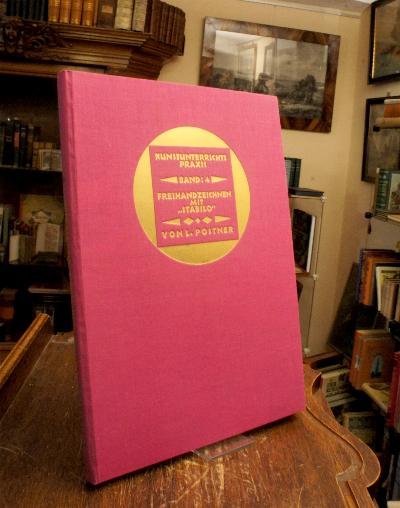 Postner, [Lorenz]: Freihandzeichnen mit Stabilo : Stabilo : Ein neues Farbmittel für moderne Unterrichtsgestaltung an den allgemein bildenden Schulen. München, Pestalozzi-Verlag, 1930. 4° (32x22), 34 S. Text mit 14 Abb. + 32 farb Tafeln in Flügelmappe des Rückendeckels [so komplett], pinkfarb Oln mit goldPräg, ergänzte kleine Reihennummer auf Rücken, kleiner Namensstempel auf Titelblatt, schönes und frisches Exemplar, [= Kunst-Unterrichts-Praxis; 4 : Methodische Anleitungen für die Praxis des Zeichen-, Kunst- und Werkunterrichts : herausgegeben von L.M.K. Capeller / später L. Postner], Stabilo-Stift, -Kreide, -Liquid