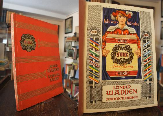 Köberich 20703.10.– Garbaty – York: Länderwappen und Nationalfarben Eine Sammlung von Bilder, die von deutscher Geschichte und wirtschaftlicher Stärke des deutschen Volkes Zeugnis ablegen sollen. Den Liebhabern unserer Fabrikate gewidmet. Berlin-Pankow, Cigaretten-Fabrik Garbaty, [1933]. 4° (33x25), 34 Bl., mit farb Vortitel (mit Pergamin-Schutzpapier), 1 doppelseite Karte, sowie 306 Sammelbilder auf 31 Tafeln, jeweils gegenüber Erklärungen, roter OKart (Brosch) mit goldReliefPräg, Umschlag gering angestaubt und minimal knittrig, anfang 5 Bl. mit kleinem Einriß, gutes vollständiges Exemplar, [Köberich, Reklame- und Sammelbilder 1872-1945/(6.Aufl); 20703.10].– Bilder komplett.–