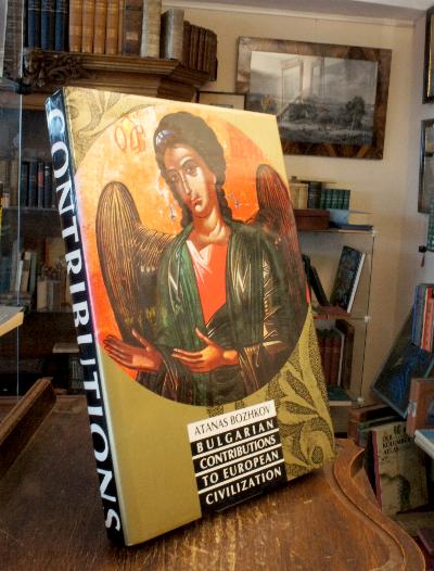 Bozhkov, Atanas: Bulgarian Contributions to European Civilization. Sofia, Bulverst, 2000. 4° (33x23), 421 p., with 396 illustrations to the text, publisher’s hardbound yellow cloth gilt decorated with pictorial jacket, tight and clean, well cared, Synthesis over 25 years of studies into numerous Bulgarian artistic and historical monuments preserved in the museums, archives, monasteries and libraries of Italy, Austria, Rumania, Russia and Greece, including the Athos monasteris.–