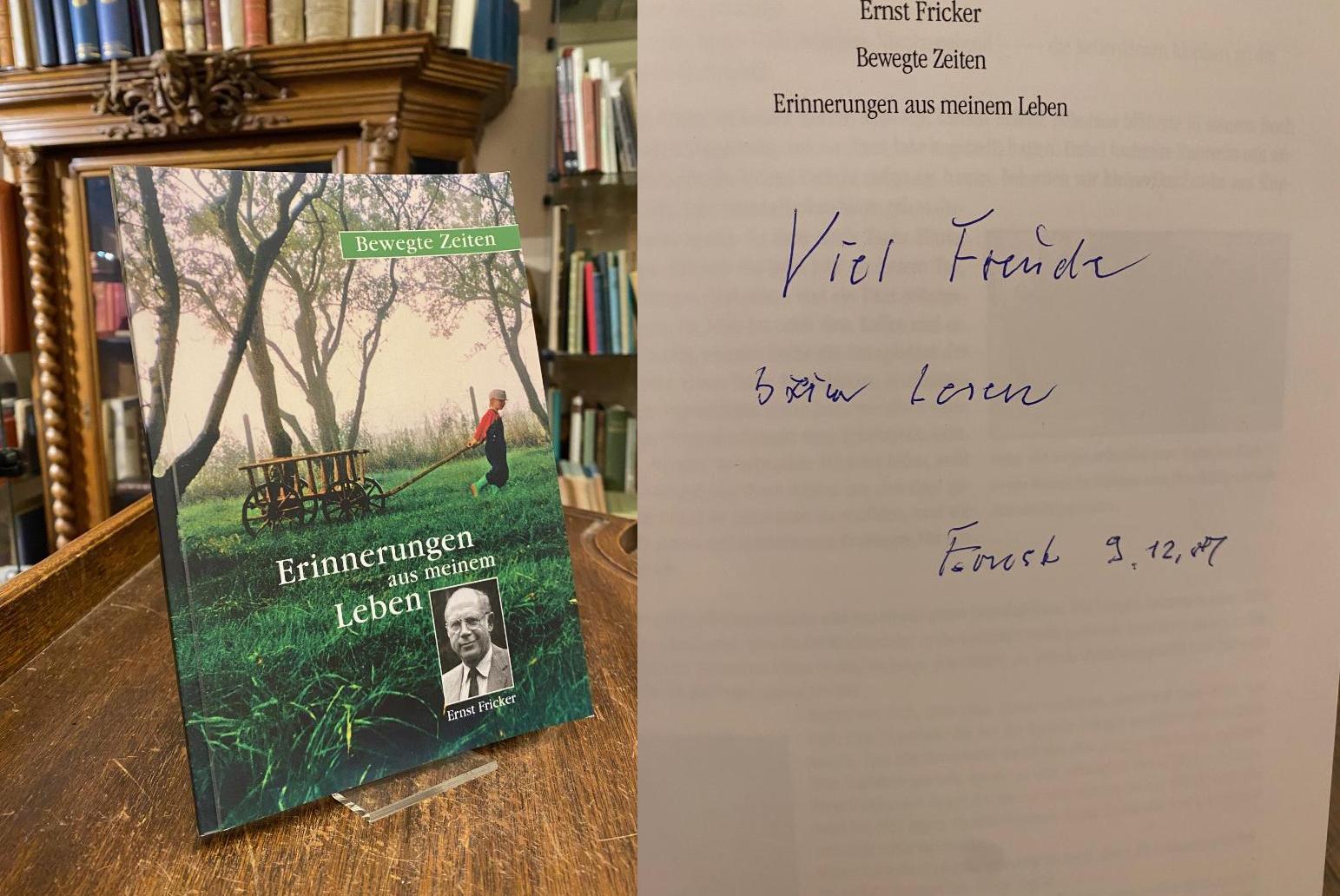Fricker, Ernst: Bewegte Zeiten : Erinnerungen aus meinem Leben. Aulendorf, Marquart (Druck), [2004]. 8° (21x15), 124 S., mit zahlr. dokumentarischen Aufnahman, fotoill OKart (Brosch), sauber und wohlerhalten, auf Vorsatz vom Autor SIGNIERT ‚Viel Freude / beim Lesen / Ernst 9.12.07‘