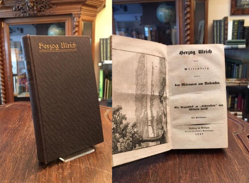 Herzog Ulrich von Würtemberg oder Der Märtyrer am Bodensee : Ein Gegenstück zu ‚Lichtenstein‘ von Wilhelm Hauff. Freiburg, Verlag von Ludwig Waizenegger, 1837. kl8° (17x11), (2), 334 S., mit Frontispiz in Holzschnitt (Ansicht der Insel Lindau von J.J. Bidermann nach Lory fils), etwas späterer Leineneinband mit goldTitel auf Deckel und Rücken, marmorSchnitt, die Ansicht kopfseitig etwas beschnitten, fest sauber und gepflegt, anonym erschienen.–