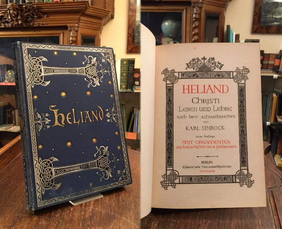 Simrock, Karl (Üb): Heliand : Christi Leben und Lehre nach dem Altsächsischen von Karl Simrock. Mit Ornamenten aus Handschriften des IX. Jahrhunderts. 3. Aufl., Berlin, G. Grote’sche Verlagsbuchhandlung, 1882. 4° (25x17), (VI), 217 S., mit zahlr. Initialen und Bordüren, blauer Oln (Kaliko) mit reicher silber/goldPrägung im Stile mittelalterlicher Prunkdeckel, Lesebändchen, minimal berieben, schönes gepflegtes Exemplar,