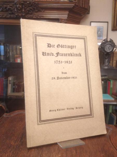 Martius, Heinrich: Die Universitäts-Frauen-Klinik in Göttingen von ihrer Gründung im Jahre 1751 als Accouchirhospital am Geissmarthore bis 1931. Herausgegeben bei Gelegenheit einer Feier zur Einweihung des Erweiterungsbaues der Kliniik am 29. November 1931. Leipzig, Georg Thieme Verlag, 1931. 4° (27x19), 46 S., mit Abb. und graph. Darst., OKart (Brosch), erstes Blatt angestaubt, sonst sauber und gepflegt, (Martius, Die Universitäts-Frauen-Klinik in Göttingen)