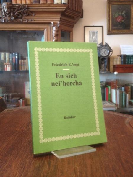 Vogt, Friedrich Emil: En sich nei horcha : Schwäbische Auslese – poetisch gekeltert. Reutlingen, Verlag Karl Knödler, (1975). kl8° (15x10), 76 S., OKart (Brosch), nahezu ungelesen, schönes gepflegtes Exemplar, [Feinäugle/König; 96 ff].– Friedrich Emil Vogt (1905 Stuegert – 1995) isch a deitscher Mundartschriftsteller ond Dialektforscher gwäa. Emma greeßra Personakreis isch’r hauptsächlich durch seine Gedicht ond Liadr em schwäbischa Dialekt bekannt worra.– Beschta Kenna vo dr schwäbischa Mundartdichtung.–