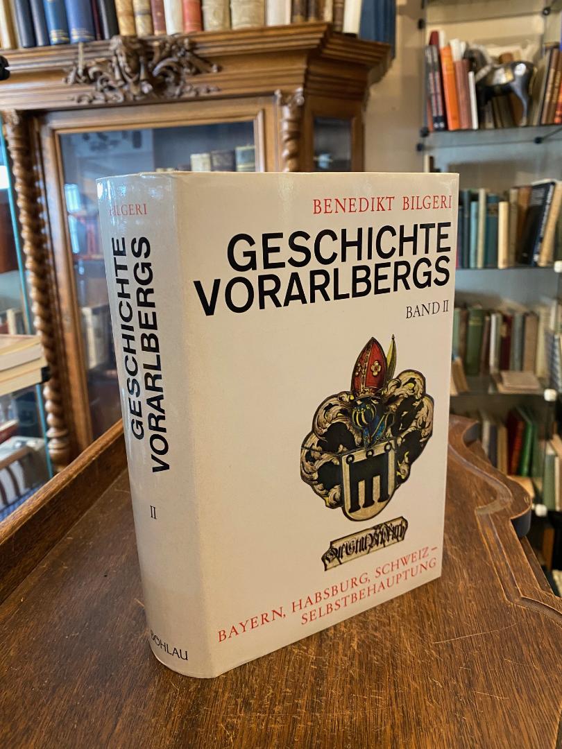Bilgeri, Benedikt: Geschichte Vorarlbergs : Band II (ca.1280- ca.1510): Bayern, Habsburg, Schweiz – Selbstbehauptung. Band 2 (von 5), Wien-Köln-Graz, Hermann Böhlaus Nachf, 1987. gr8° (23x15), 630 S., 1 Bl., mit einigen teils farb Tafeln, heller Oln mit ill OU, Besitzvermerk auf Vorsatz, kleiner Namensstempel auf Titelblatt,
