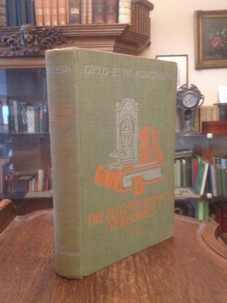 Krüger, Otto F.W.: Die Illustrations-Verfahren : Eine vergleichende Behandlung der verschiedenen Reproduktionsarten, ihrer Vorteile, Nachteile und Kosten. Leipzig, F.A. Brockhaus, 1914. 8° (24x16), VII, 290 S., mit 198 TextAbb. + 73 (von 74 Tafeln) in unterschiedlichsten Techniken (Stahlstich, Bromsilber, Prägedrucke u.v.a), grüner Oln mit Prägung, Einband etwas lichtverfärbt und angestaubt, Schnitt sowie vereinzelte Tafeln etwas stockfleckig, (Die Illustrationsverfahren) es fehlt Tafel 70 (Kombinations-Offset)