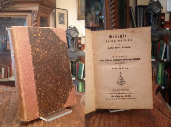Müller, D* C*: Gedichte, Aufsätze und Lieder im Geiste Marc(elin). Sturms : Gesammelt und jedem lustigen Männer-Zirkel gewidmet. Neueste Auflage. Rorschach, J.G. Schmied’sche Buchdruckerei, 1853. 12° (14x11), IV, 273 S., Hln d.Zt. mit Rest eines Rückenschilds, kleiner Name auf Titelblatt, etwas gebräunt, ordentliches Exemplar, [Hayn/Gotendorf, Bibliotheca Germanorum Erotica & Curiosa; II,529/V,189].– erstmalig erschienen 1826. – ’Darin die ‚Kapuzinerbeichte‘ und ähnliche derbe Jocosa, größten Theils in niederbayerischer Mundart. Der Verfasser Carl Müller (1796-1873) führte in Freundeskreisen den Namen ‚Sau-Müller‘. Der derbe und häufig cynische Humor seiner Dichtungen liefert den Beweis, dass ihm dieser nom de guerre mit Recht zukam.’ (Kühl)