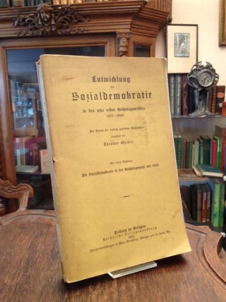 Wacker, Theodor: Entwicklung der Sozialdemokratie in den zehn ersten Reichstagswahlen (1871-1898). Auf Grund der amtlich geprüften Wahlziffern dargestellt. Mit einem Nachtrag: Die Sozialdemokratie in der Reichstagswahl von 1903. Freiburg, Herder’sche Verlagshandlung, 1903. 8° (22x14), LV, 438 S., OKart (Brosch), Umschlag etwas angestaubt/angeschmutzt/berieben, Stempel auf Vortitelblatt, innen sauber, nahezu ungelesen, gutes Exemplar,