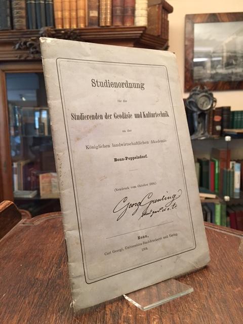 Landwirtschaftliche Akademie Bonn (Hrsg): Studienordnung für die Studierenden der Geodäsie und Kulturtechnik an der Königlichen landwirtschaftlichen Akademie Bonn-Poppelsdorf. (Neudruck vom Oktober 1904). Bonn, Carl Georgi Universitäts-Druckerei und Verlag, 1904. 8° (22x14), 24 S., OKart (Brosch), Umschlag etwas verletzt und mit dekorativem Besitzvermerk, 2 Eckknicke, ordentliches Exemplar, Alis Benz, Lehrer für Geometrie und Feldmessen an der Kgl. Landwirtschaftlichen Winter-Schule in Augsburg.–