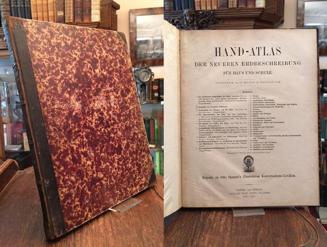 Hand-Atlas der neueren Erdbeschreibung für Haus und Schule. Vollständig in 34 Karten in Farbendruck : Beigabe zu Otto Spamer’s Illustrirtem Konversations-Lexikon. Leipzig-Berlin, Verlag von Otto Spamer, 1875-1880. 4° (30x23), 3 Bl., 34 teils doppelseitige mont Karten, rückseitig Tabellen und Informationen, marmor OHldr mit goldRPräg, Kanten etwas bestossen, vereinzelt etwas staubstockfleckig, gutes gepflegtes Exemplar, fest und sauber,