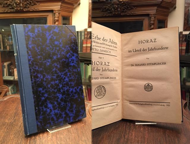 Horaz : Quintua Horatius Flaccus (65v-8v). – Stemplinger, Eduard: Horaz im Urteil der Jahrhunderte. Leipzig, Dieterich’sche Verlagsbuchhandlung, 1921. 8° (22x15), 212 S., marmor Hln d.Zt., Rücken minimal bestossen, Papier gebräunt, nahezu ungelesen, fest sauber und gepflegt, [= Das Erbe der Alten; II/5 : Schriften über Wesen und Wirkung der Antike : herausgegeben von Otto Immisch],