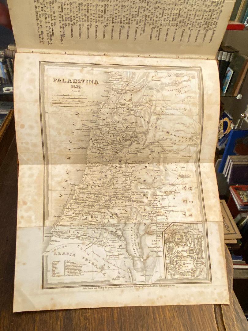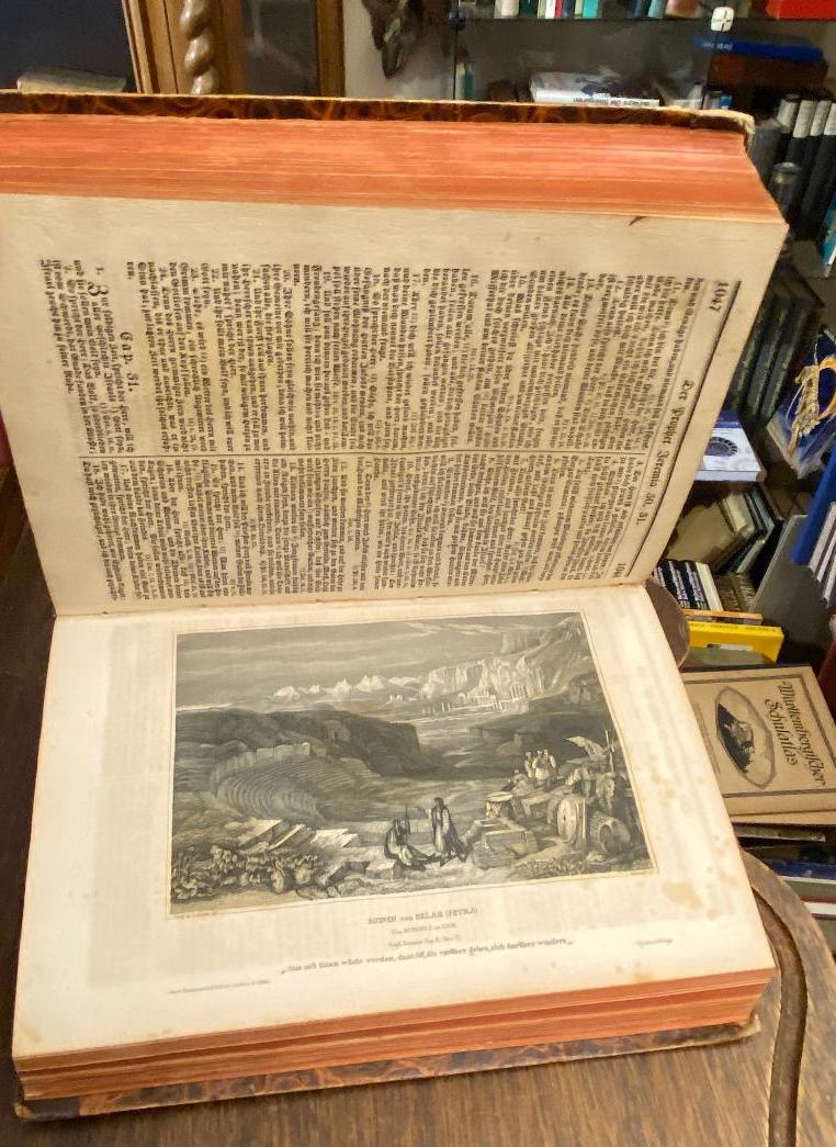 Bibel. – AT. – NT. – Luther, Martin (Üb): Die Pathen-Bibel oder die ganze Heiligen Schrift alten und neuen Testaments nach der deutschen Uebersetzung Dr. Martin Luther’s : Prachtausgabe mit Petit-Schrift. Mit 32 Stahlstichen und 1 Karte von Palästina. Ladenpreis: 31/2 Thaler Sächs. Hildburghausen; Amstersam und New-York, Druck und Verlag vom Bibliographischen Institut, 1836. gr8° (24x15), 1487 (AT), 438 (NT) Sp., 1 Bl., mit Frontispiz (Luther), 17 Kupferstichen im AT und 13 Kupferstichen im NT, 1 einfaltete Karte von Palästina 1832, marmor Hldr d.Zt. mit grüner RSchild und etwas RückengoldPrägung, dreiseitiger Rotschnitt, Ecken etwas bestossen, gering berieben, Namensstempel auf unterer Ecke des Vorsatzes, teils schwach stockfleckig, ordentliches gepflegtes Exemplar, (Pathenbibel).– [Sarkowski BI, 3 d 19].–