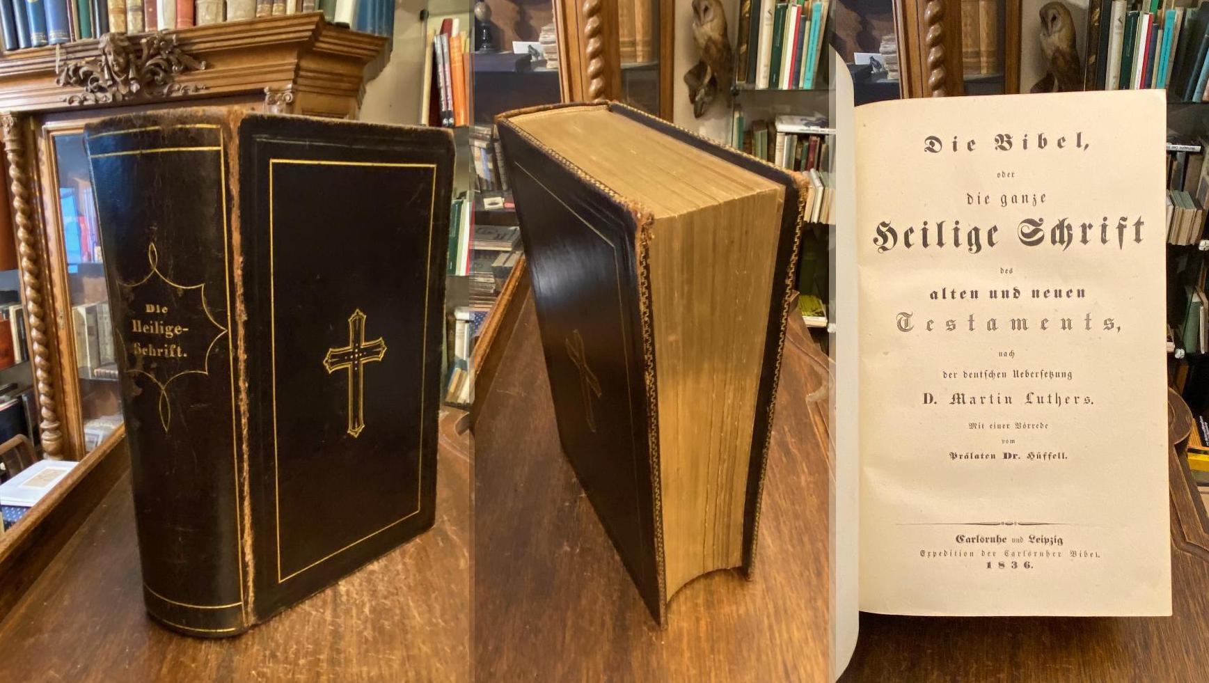 Bibel. – AT. – NT. – Luther, Martin (Üb): Die Bibel oder die ganze Heilige Schrift des alten und neuen Testaments nach der deutschen Uebersetzung D. Martin Luthers. Mit einer Vorrede vom Prälaten Dr. (Ludwig) Hüffel. [Mit Apokryphen]. Carlsruhe und Leipzig, Expedition der Carlsruher Bibel, 1836. 4° (26x17), VIII, 920 (AT), 237 (NT) S., 3 Bl., mit illustriertem Vortitel, 15 Stahlstichen im AT, sowie Frontispiz und weitere 12 Stahlstichtafeln im NT, brauner Ldr mit etwas goldPrägung, Seitenkanten Vergoldung, dreiseitiger Goldschnitt, weisse MoireeVorsätze, Kanten etwas berieben, die Tafeln teils leicht stockfleckig, schönes gepflegtes Exemplar, Karlsruher Bibel mit 28 Stahlstichen.–
