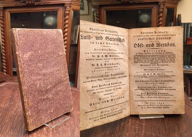 Reichart, Christian / Völker, Hieronymus Ludwig Wilhelm (Bearb): Christian Reichart’s, weil. Rathmeisters zu Erfurt, mehrerer gelehrten Gesellschaften Mitgliedes, Praktisches Handbuch für den Obst- auch Weinbau : Anleitung zur Anlage, Erziehung und Veredlung der Obstbäume; zur Behandlung der Orangeriestämmchen, der Hoch- und Zwergstämme; zur Erkenntniß, und Heilung der Krankheiten, Fehler und Schäden der Obstbäume wie auch zur Einerntung und Benutzung des Obstes überhaupt; dann zur Gewinnung der verschiedenen Obstarten, als: des Kers-, Stein-, Schalen- und Beeren-Obstes insbesondere, und endlich zur Erziehung und Vermehrung der Weinstöcke und Weingärten. Der sechsten Auflage, neu bearbeitet und herausgegeben von H.L.W. Völker, Professor der Oekonomie, Technologie und Kameralwissenschaft in Erfurt … zweyter mit dem pomologischen Zauberringe vermehrter Abdruck für österreichische Landwirthe nach dem Wiener Münz- Maß und Gewichts-Fuße eingerichtet von Carl Friedrich Thomann. Grätz, gedruckt auf Kosten des Herausgebers mit J. Andreas Kinerich’schen Schriften, 1821. 8° (18x11), XIV, 168 S., mit 17 Abb. auf 1 mehrfach gefalteten Tafel, Pbd d.Zt., alter Besitzvermerk auf Innenspiegel, teils etwas stockfleckig, gutes Exemplar, [= Reicharts Land- und Gartenschatz in sechs Theilen; 4 : Sechste Auflage neu bearbeitet und herausgegeben von H.L.W. Völker und J.J. Bernhardi // Neustes und wohlfeilste Bibliothek der vorzüglichsten ökonomischen Werke der Auslandes über alle Zweige der Landwirthschaft … herausgegeben von Carl Friedrich Thomann; 4], [Dochnahl, Bibliotheca Hortensis; 126].–