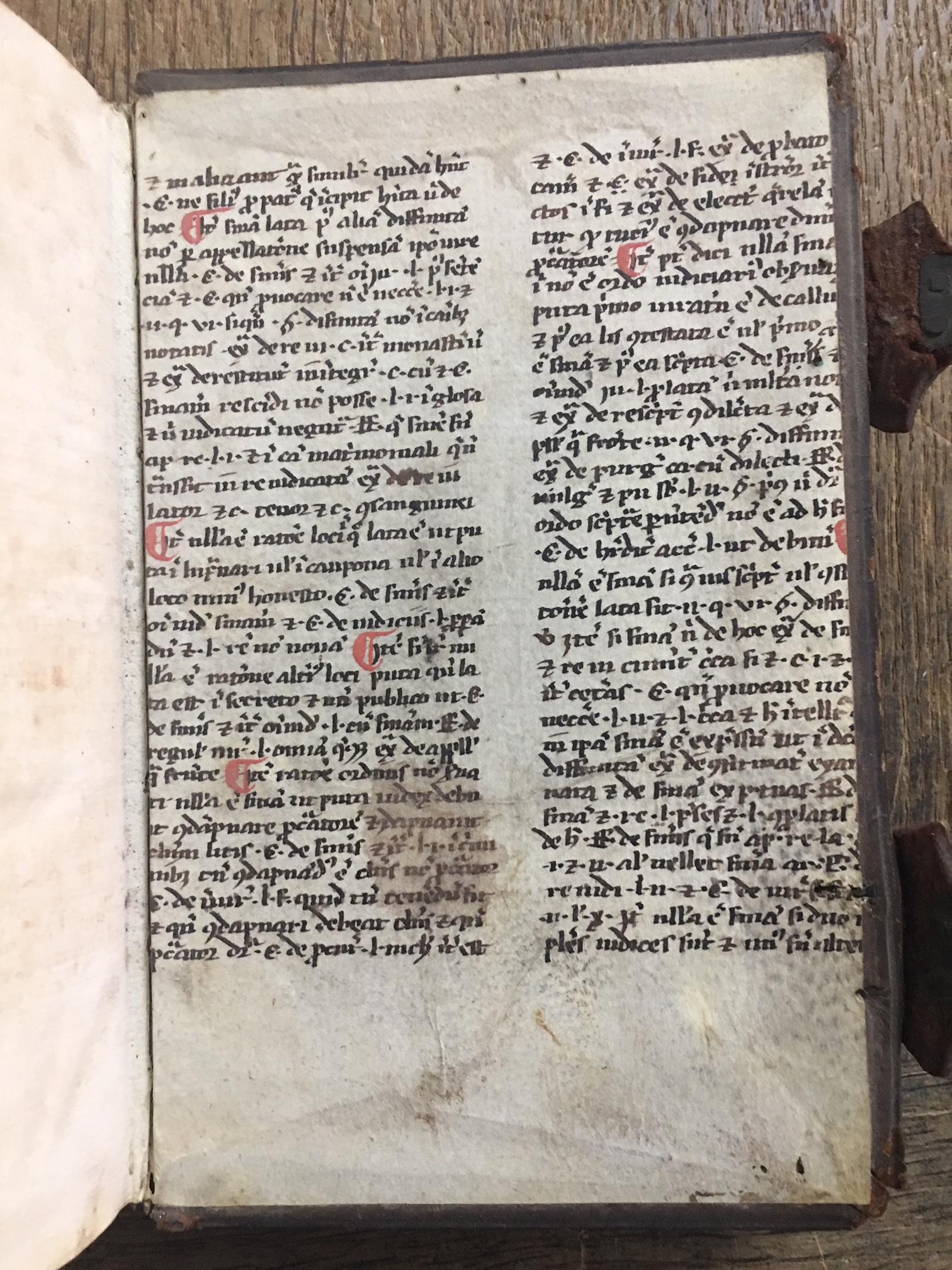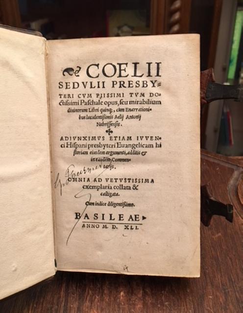 [A.] Sedulius, Caelius.– Nebrija, Elio Antonio de (Bearb) / [B.] Iuvencus, Gaius Vettius Aquilinus. – Badius Ascensius, Jodocus (Bearb): [A.] Coelii Sedulii Presbyteri cum piissimi tum doctissimi Paschale Opus, seu mirabilium divinorum libri quinqu, cum enarrationibus luculentissimis Aelii Antonii Nebrissensis. [B.] Adiunximus etiam Iuvenci Hispani Presbyteri Evangelicam Historiam eiusdem argumenti, additis et in eandem commentariis. // Omnia ad vetustissima exemplaria collata & castigata. Cum indice diligentissimo. Basileae [Basel], (apud Barptholomaeum VVesterhemerum) [Bartholomaeus Westheimer], 1541. kl8° (16x10), 1 wBl., [16], 542, [2] S., 1wBl., (= Sign. a-z8, A-M8), M8recto mit Druckerbezeichnung und M8verso mit Druckermarke (Schlange abwärts um Pfeil), blindgeprägter brauner Ledereinband d.Zt. über Holzdeckel, mit 2 intakten Messingschliessen (1 abgerissenund beiliegend), Bezug an den Kapitalen mit Fehlstellen, Innenspiegel bezogen mit einer gotischen Minuskel, Name auf Titelblatt, gutes gepflegtes Exemplar, [VD16 S 5248].– Kolophon: ‚BASILEAE, APVD BARPTHOLOMAEVM VVESTHEMERVM. ANNO M.D.XLI.‘.— Mit Einleitung von Bartholomäus Westheimer.– Enthält neben Sedulius und Iuvencus ausserdem Auszüge aus Epigrammata von Prosper Aquitanus und aus De scriptoribus ecclesiasticis von Johannes Trithemius.–– [A.] Caelius (auch Coelius) Sedulius (+ um 450) war ein lateinisch-christlicher Dichter des 5. Jahrhunderts.– Als sein Hauptwerk gilt das Paschale Carmen, das in fünf Büchern die Evangelien von der Geburt Christi bis zur Himmelfahrt in Hexametern nacherzählt.— [B.] Gaius Vettius Aquilinus Juvencus war ein hispanischer Presbyter, der zur Zeit Konstantins des Großen (306–337) lebte und neben Commodian (um 270) der erste namentlich bekannte christliche Dichter.– Von seinen beiden nachgewiesensen Epen ist nur erhalten das Werk ‚Evangeliorum libri quattuor‘ (Vier Bücher der Evangelien). Dieses Epos ist eine Evangelienharmonie in insgesamt etwa 3200 Hexametern, die sich vor allem auf das Evangelium nach Matthäus, in Teilen auch auf die Evangelien nach Lukas und Johannes stützt. Es fand schnell weite Akzeptanz in der christlichen Gelehrtenwelt. Vor allem in der Zeit der Karolinger wurde das Werk häufig rezipiert, wie die zahlreichen Handschriften aus dem 9. Jahrhundert zeigen. Erstmals gedruckt wurden die Evangeliorum libri um 1490.