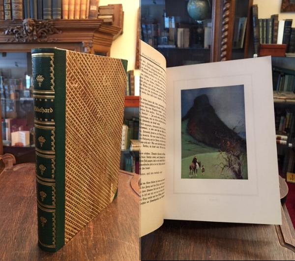 Scheffel, Joseph Victor von: Ekkehard. Mit Bildern von [Karl] Mühlmeister. Stuttgart, K. Thienemann’s Verlag, [1923]. 4° (25x18), 293, (3) S., mit 33 teils ganzseitigen s/w-Illustrationen, sowie 16 farb Illustrationen auf Tafeln, grüner OHldr mit goldRPräg, dreiseitiger FarbSchnitt, Ecken minimal bestossen, Bezugspapier gering berieben, nahezu ungelesen, schönes gepflegtes Exemplar, Vorzugsausgabe in grünem Halbleder.–