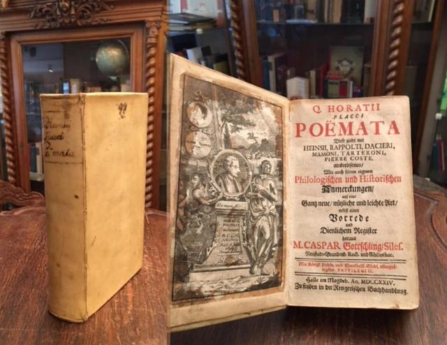 Horaz : Quintua Horatius Flaccus (65v-8v). – Gottschling, M. Caspar (1679-1739): Q. Horatii Flacci Poemata : Diese giebt mit Heinsii, Rappolti, Dcieri, Massoni, Tarteroni, Pierre Coste, auserlesen / wie auch seinen eignen Philologischen und Historischen Anmerkungen auf eine gantz neue nützliche und leichte Art / nebst einer Vorrede und Dienlichem Register heraus M. Caspar Gottschling, Sils., Neustadt-Brandenb. Rect- und Bibliothe. Halle im Magdeb., Renger’ische Buchhandlung, 1724. 8° (18x10), 7 Bl., 560, S., 4 Bl., mit gestochenem Frontispiz, Pgmt d.Zt. mit handschriftl RTitel, Vorsatz etwas fleckig, Frontispiz in den Rändern leimschattig, gelegentliche kleine handschriftliche Anmerkung, gutes Exemplar, [VD18 12452300].– lateinischer Text mit deutschen Anmerkungen/Glossen.–