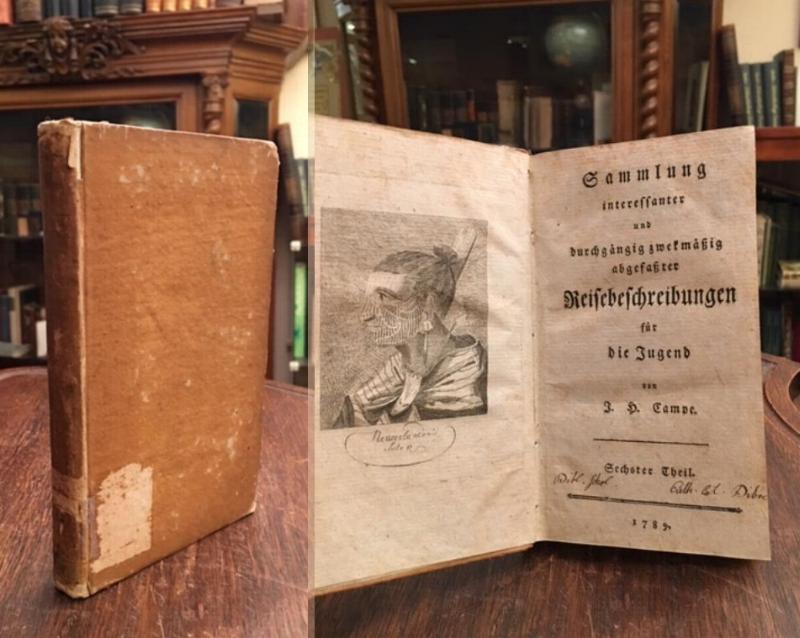 Campe, [Joachim Heinrich] (Hrsg): Sammlung interessanter und durchgängig zwekmäßig abgefaßter Reisebeschreibungen für die Jugend : Sechster Theil. o.O., o.V., 1789. kl8° (17x10), 270 S., mit Fontispiz (Neuseelländer), Pbd. d.Zt. mit handschriftl RSchild, Ecken bestossen, grösserer Abrieb durch entferntes Rückenetikett, Besitzvermerk auf Vorsatz und klein auf Titel, fest und sauber, enthält: Beschluß der Beschreibung einer Reise um die Erdkugel, angestellt von dem englischen Schiffskapitain Cook, und den Gelehrten Banks und Solander in den Jahren 1768 – 1771.– [der erste Teil erschien im 5. Theil der Reisebeschreibungen].