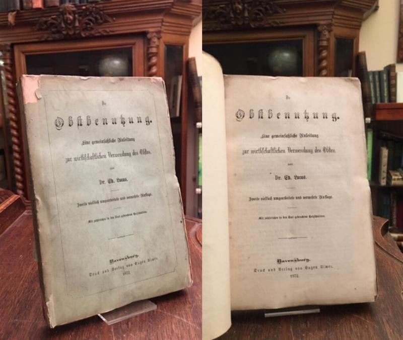 Lucas, [Eduard]: Die Obstbenutzung : Eine gemeinfaßliche Anleitung zur wirthschaftlichen Verwendung des Obstes. Mit zahlreichen in den Text gedruckten Holzschnitten. 2., vielfach umgearbeitete und vermehrte Aufl., Ravensburg, Verlag von Eugen Ulmer, 1872. 8° (22x15), XII, 291 S., mit 53 Text-Holzschnitten, OKart (Brosch), angestaubt, Umschlag etwas randverletzt, unbeschnitten/unaufgeschnitten, offensichtlich ungenutzt, [Pfeiffer; 9].– erstmalig erschienen 1856.–