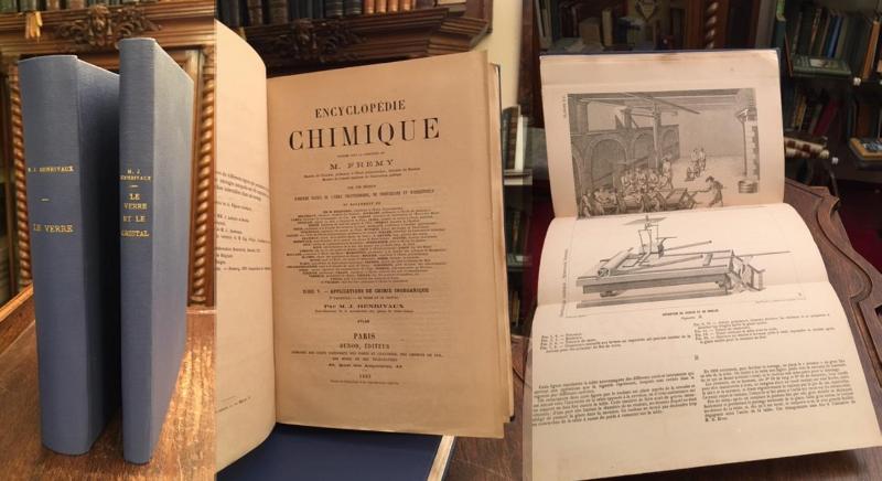 Henrivaux, M- J.: Le Verre : Texte et Atlas : [extrait de l’Encyclopedie chimique Tom V/5. publiee sous la direction de M. Fremy]. 2 vol., Paris, Dunod, 1883. 4° (25x16), 483 p. (le verre), 44 [recte 484-526] p. (statistique de l’industrie due verre), 527-530 (index), avec 240 figures, atlas: 26 planches depliees, reliure rigide neuf pleine toile bleu avec titre dore sur dos, texte avec quelques rousseurs, bon et solide,