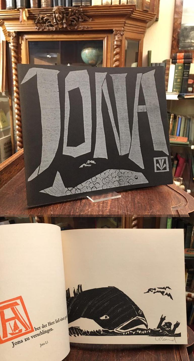Willand, Detlef (1935 –). – Willand, Detlef (Ill) // Petri, Dieter / Thierfelder, Jörg (Text): Jona : 9 Holzschnitte von Detlef Willand. Bietigheim, Verlag Galerie im Unteren Tor Stefan Heiland, (1983). 4°quer (22x26), [34] S., Blockbuchbindung, mit 9 roten Holzschnitt-Initialen und 9 einzeln handsignierten Original-Holzschnitten, ill OKart (englOBrosch), fest sauber und gepflegt, handschriftlich nummeriertes und von Willand zusätzlich im Impressum signiertes Exemplar 62 von 90 (GA 1500).– ohne Schuber.–