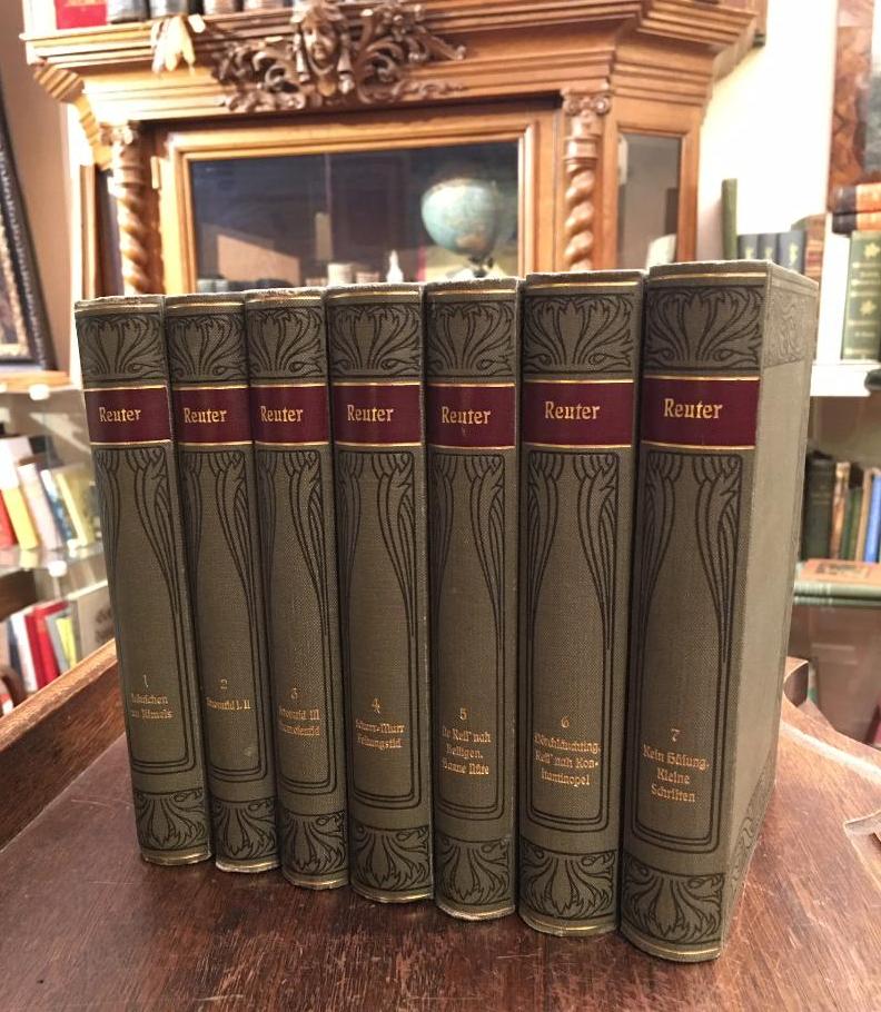 Reuter, Fritz (1810-1874). – Seelmann, Wilhelm (Hrsg): Reuters Werke [in sieben Bänden]. Kritisch durchgesehene und erläuterte Ausgabe. Herausgegeben im Verein mit Conrad Borchling und Ernst Brandes. 7 Bände in 7 (so komplett), Leipzig; Wien, Bibliographisches Institut, [1905/06]. 8° (19x12), 64,436; 472; 461; 521; 469; 551; 534 S., FrontispizPorträt, 1 gefaltetes HandschriftenFaksimile, 1 Karte, einheitliche grüne Olnbde mit Jugendstil-Schmuckrahmen, rot geprägt RSchild, dreiseitiger GrünSchnitt, florale SchmuckVorsätze, Band 6 wenige Blatt mit kleiner Randverletzung, nahezu ungelesen, sehr schön, [= Meyers Klassiker-Ausgaben], [Sarkowski BI 22 a.40].— Bandeinteilung: Band 1: Biographische Einleitung.– Läuschen un Rimels.— Band 2: Ut mine Stromtid I+II.— Band 3: Ut mine Stromtid III.– Ut de Franzosentid.— Band 4: Schnurr-Murr.– Ut mine Festungstid.— Band 5: De Reis’ nah Belligen.– Hanne Nüte un de lütte Pudel.— Band 6: Dörchläuchting.– Montecchi un Capuletti, oder De Reis’ nah Konstantinopel.— Band 7: Kein Hüsung.– De Urgeschicht von Meckelnborg.– Kleine Schriften.–