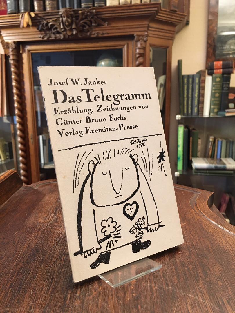 Janker, Josef W.: Das Telegramm : Erzählung. Zeichnungen von Günter Bruno Fuchs. Düsseldorf, Verlag Eremiten-Presse, (1977). 8° (21x13), [40] S., mit 7 ganzseitigen Illustrationen, ill OKart (Brosch), Blockbuchbindung, Besitzvermerk auf Vortitelblatt, fest sauber und gepflegt, [= Eremiten Presse : Broschur; 77 : Eine Reihe, die aus der Reihe tanzt. Zeitgenössische Literatur und Grapphik in bibliophil gestalteten preiswerten Ausgaben], von Janker auf Vortitelblatt SIGNIERT und datiert 20. Januar 1979.–