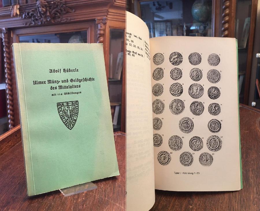 Ulm. – Häberle, Adolf: Ulmer Münz- und Geldgeschichte des Mittelalters. Ulm, Verlag des Museums der Stadt Ulm, 1935. 8° (22x15), 120 S. + 8 Tafeln mit 114 Abb., grün OKart (Brosch), gering lichtverfärbt, kleiner Name auf Vorsatz, fest sauber und gepflegt, [= Ulmer Schriften zur Kunstgeschichte; 1 : herausgegeben von Adolf Häberle],