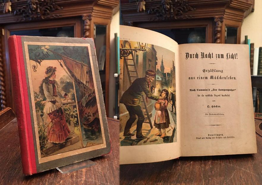 Höcker, Oskar: Durch Nacht zum Licht! : Erzählung aus einem Mädchenleben. Nach Cummin’s ‚Der Lampenputzer‘ für die weibliche Jugend bearbeitet. Mit Farbendruckbildern. Reutlingen, Verlag von Enßlin und Laiblin, [1885]. 8° (19x13), 176 S., mit 4 chromolith Tafeln, OHln mit mont Deckelbild, goldRückenTitel berieben, Kanten bestossen, Exlibris/Name auf Vorsatz, gelegentlich etwas fleckig, gutes festes Exemplar, Oskar Höcker (1849-1894) war Verfasser zahlreicher historisch-patriotischer Jugendschriften. Seine Bücher gehören zu denjenigen, die als ‚tendenziös‘ von der Jugendschriftenbewegung heftig bekämpft wurden. Wolgast zählt Höcker zu den ‚allerschlechtesten Jugenderzählern‘!.– Hier eine Erzählung nach ‚Maria Suzanna Cummins, The Lamplighter‘