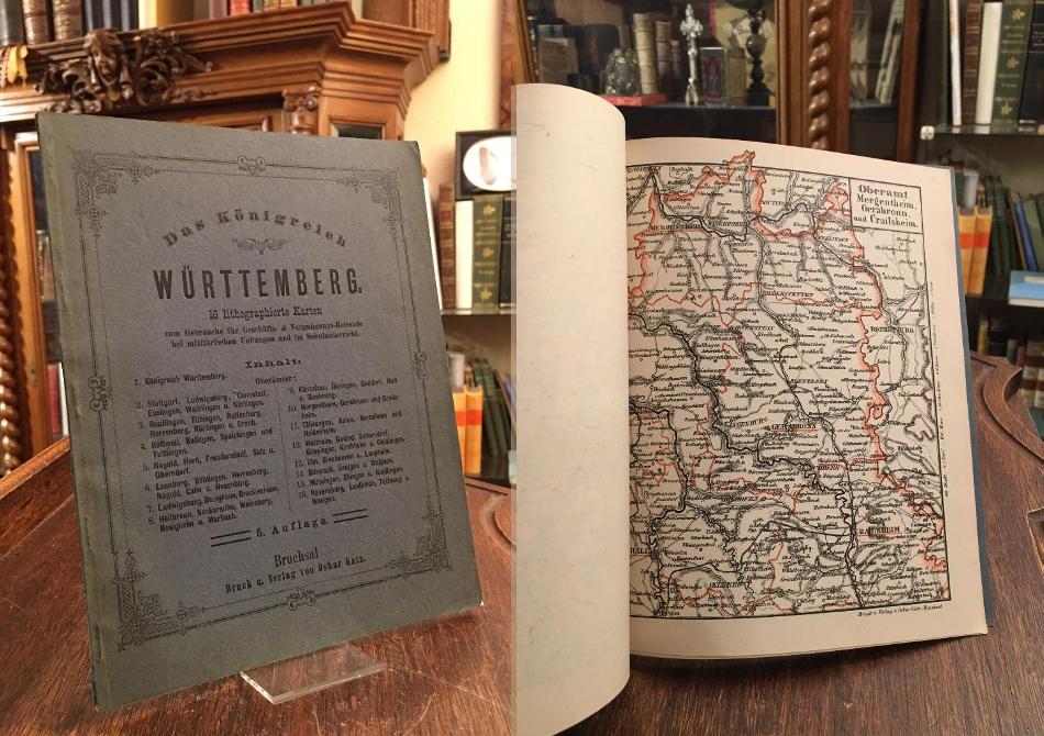 Das Königreich Württemberg : 16 lithographierte Karten zum Gebrauche für Geschäfts- & Vergnügungs-Reisende, bei militärischen Uebungen und im Schulunterricht. 5. Aufl., Bruchsal, Verlag von Oskar Katz, [um 1880]. 8° (23x18), 16 Karten, OKart (Brosch) mit Schmuckrahmen und Inhaltsverzeichnis, Umschlag minimal angestaubt, ohne Gebrauchsspuren, offensichtlich ungenutzt,