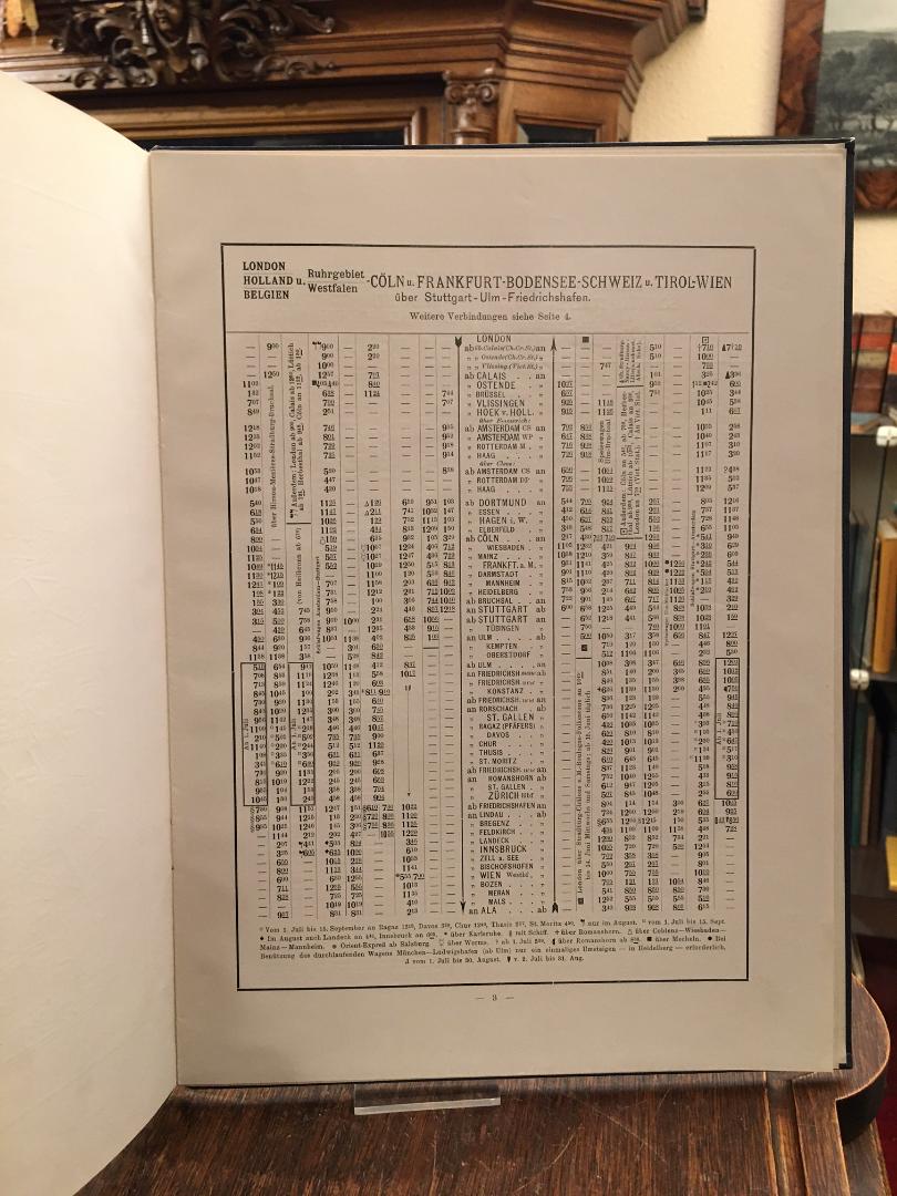 Reise-Album der Königl. Württembergischen Staatseisenbahnen. (Berlin), (Pozsonyi & Berger : Expedition: Stuttgart, A. Bonz Erben) Juni 1911. 4° (32x23), 2 Bl., (Vorwort, Inhalt), 85, (2) Beschriebender Teil mit zahlr. fotograf Aufnahmen, 11 S. (Fahrpläne), + 1 doppelseitige Eisenbahnkarte, blau Oln gewachst mit goldTitel, rückseitig montierte farb Leibniz-Werbung (Claus Meyer), Innenspiegel mit Kleberest/Abrieb, erstes Blatt angelockert, sonst nahezu ungenutzt, schönes gepflegtes Exemplar, [= Reise-Album der Königl. Württembergischen Staatseisenbahnen; 2] Das Reisealbum liegt während des ganzen Jahres in den Abteilen der ersten, zweiten und dritten Wagenklasse der Schnellzüge, Eilzüge und Personen-Fernzüge, in den Bahnhöfen, in den Wartesälen und Restaurationslokalitäten I. und II. Klasse der Württembergischen Staatsbahnen, in den Lesezimmern erster Ärzte , der hervorragenden Kur- und Badeorte, sowie Sanatorien, ferner in den bedeutendsten Hotels usw. des In- und Auslandes aus. … Vorliegendes Reisealbum ist dazu berufen, den Fremdenverkehr in den an landschaftlichen Reisen so reichen Königreich Württemberg fördern zu helfen und durch seine geschäftlichen Ankündigungen der reisenden Welt als ein verläßliches Nachschlagebuch zu dienen. (Verlag)