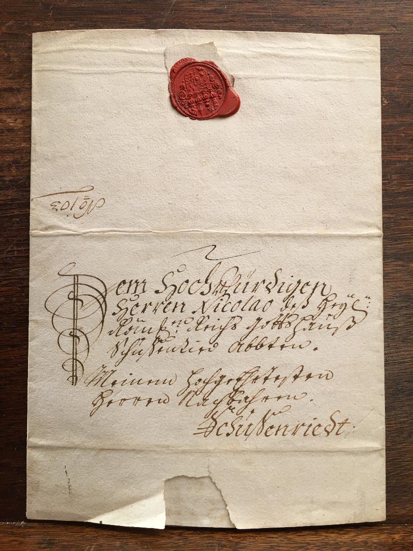 Haus Waldburg-Wolfegg-Waldsee, 1758. – Brief. – ‚Dem Hochwürdigen / Herren Nicolao deß Heyl: Röm. Reichs Gotts Hauß / Schußenried Abbten. / Meinem HochgeEhrtesten Herr Nachbahren. / Schußenriedt‘ : Brief-Doppelbogen, Bütten mit Wasserzeichen, 1 S. beschrieben mit akurater Handschrift in brauner Tinte, als Brief gefaltet mit fürstlichem Wachssiegel. [Bad] Waldsee, Schloss, 15. Februar 1758. 4° (35x22), sehr guter Zustand, Lieferung in archivbeständiger Urkundenmappe.—