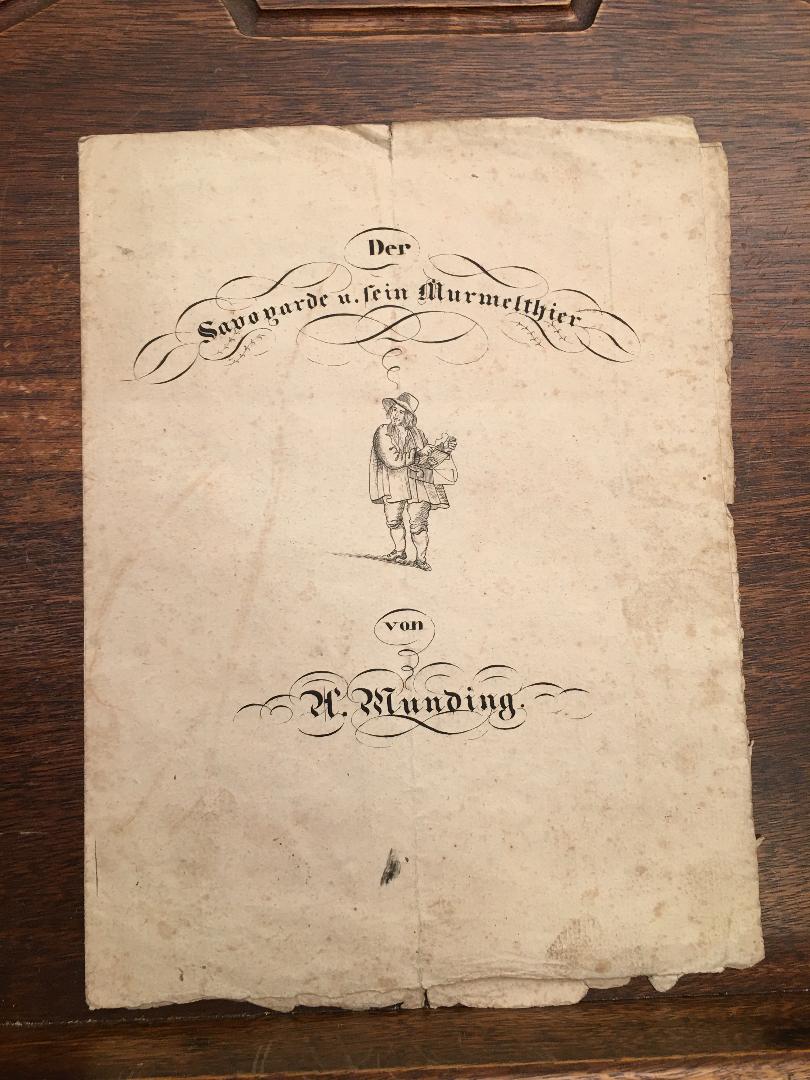 Munding, A.: Der Savoyarde u. sein Murmelthier : [Notendruck für] Singstimme, Quitarre und Pianoforte. o.O., o.V., o.J. [um 1830]. 4° (26x20), [2] Bl., dreiseitiger lithographierter Druck (Titelblatt mit kleiner Illustration, sowie 2 Seiten Noten mit 5 Strophen Text), angestaubt, etwas ausgefranst, faltspurig, vorliegendes Lieder-Blatt wohl zum Mitsingen gedacht … Diese Art Ephemera hat sich kaum erhalten und wird in Bibliotheken nur selten katalogisiert.—