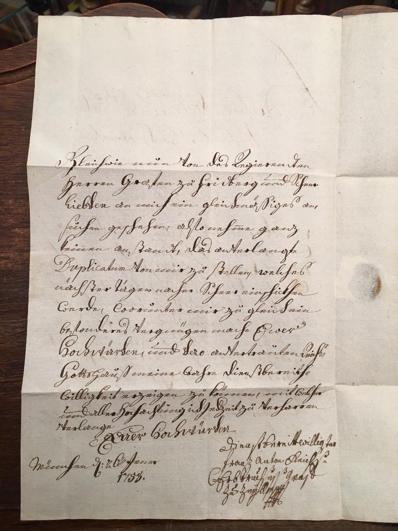 Haus Waldburg-Wolfegg-Waldsee, 1758. – Brief. – ‚Dem Hochwürdigen / Herren Nicolao Abbten des Heyl: / Röm. Reichs Gotts Hauses / Schussenried Meinen / insonders HochgeEhrte / Herren. / Schussenried‘ : Brief-Doppelbogen, Bütten mit Wasserzeichen, 2 S. beschrieben mit akurater Handschrift in brauner Tinte, als Brief gefaltet mit fürstlichem Wachssiegel. München, 26. Juni 1758. 4° (33x20), sehr guter Zustand, Lieferung in archivbeständiger Urkundenmappe.—