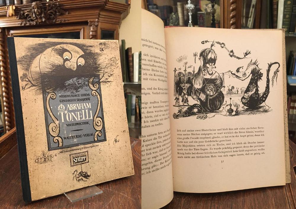 Tieck, Ludwig: Merkwürdige Lebensgeschichte Sr. Majestät Abraham Tonelli. Illustriert von Günther Strupp. 1.-5. Tsd., Dietmannsried/Allgäu und Heidelberg, Walter Rau Verlag, 1947. 8° (23x18), 103, (5) S., mit 28 (teils halb- und ganzseiitge Illustrationen, ill OPbd mit restauriertem Leinenrücken, Kanten gering berieben, schönes gepflegtes Exemplar,