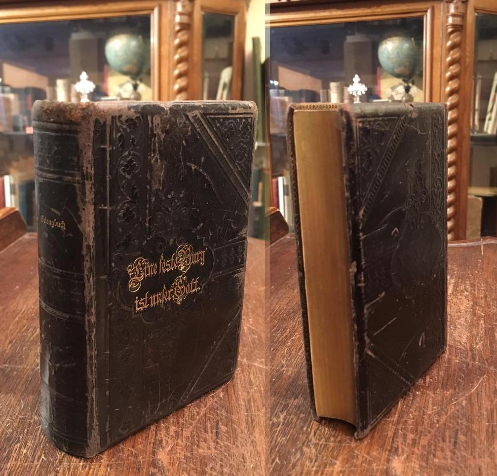Gesangbuch für die evangelische Kirche in Württemberg. Stuttgart, Verlags-Comptoir des neuen evangelischen Gesangbuchs, 1887. kl8° (15x10), VIII, 528, 168, VIII S., mit Frontispiz und illustriertem Vortitel in gold auf Glanzpapier, Oldr mit reicher Blindprägung und goldenem Sinnspruch ‚Eine feste Burg ist unser Gott‘, dreisieitiger goldSchnitt, goldene InnenkantenFiletten, weisse MoireeVorsätze, Einband berieben, altes Widmungsblatt montiert verso Frontispiz, wenige Blatt in Folge mit FeuchtigkeitsEckfleck, gutes und festes Exemplar, Anhang mit Leidensgeschichte und sonntäglichen Evangelien und Episteln.–