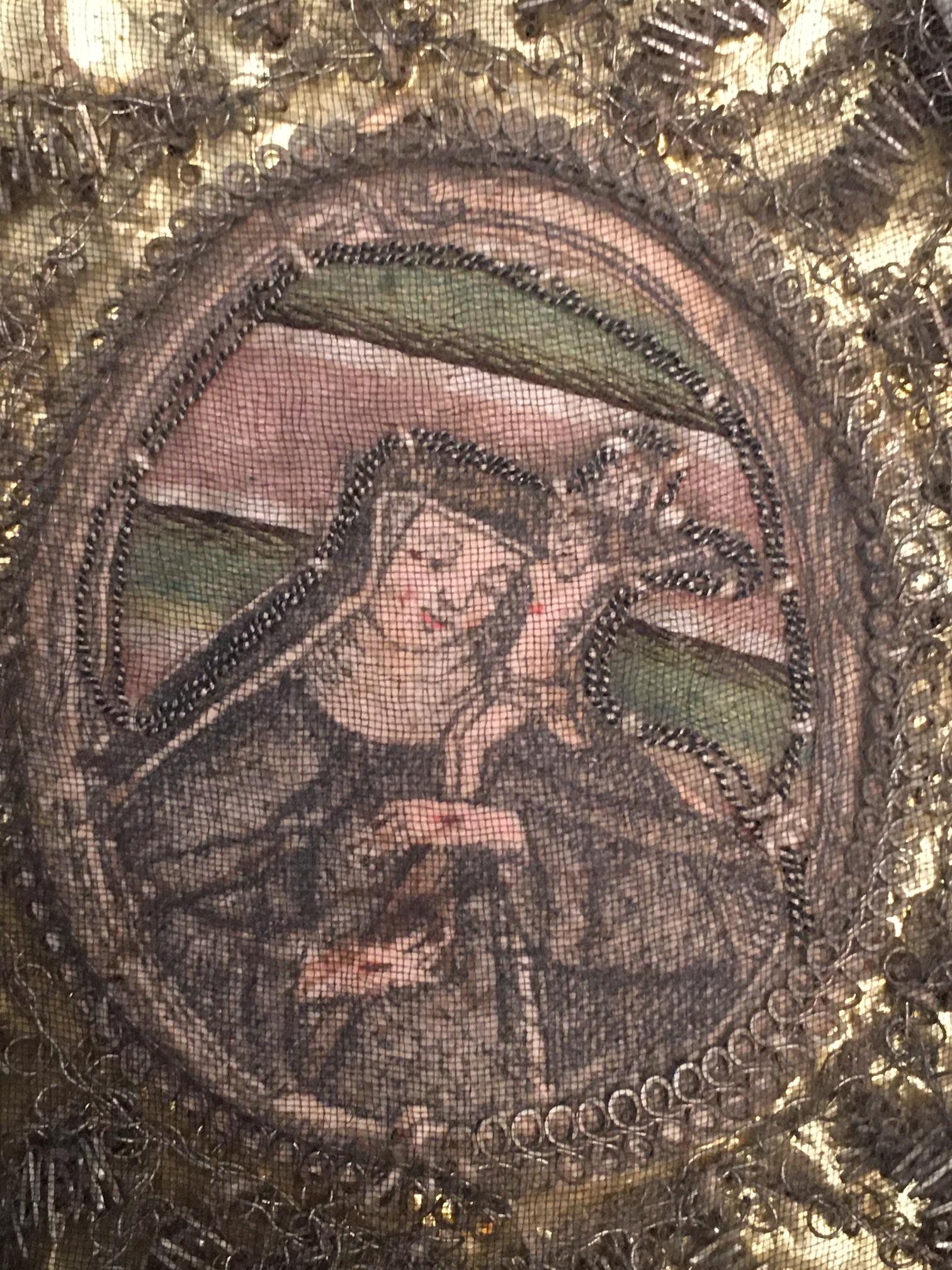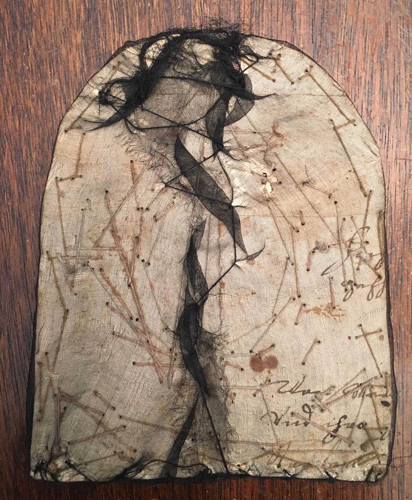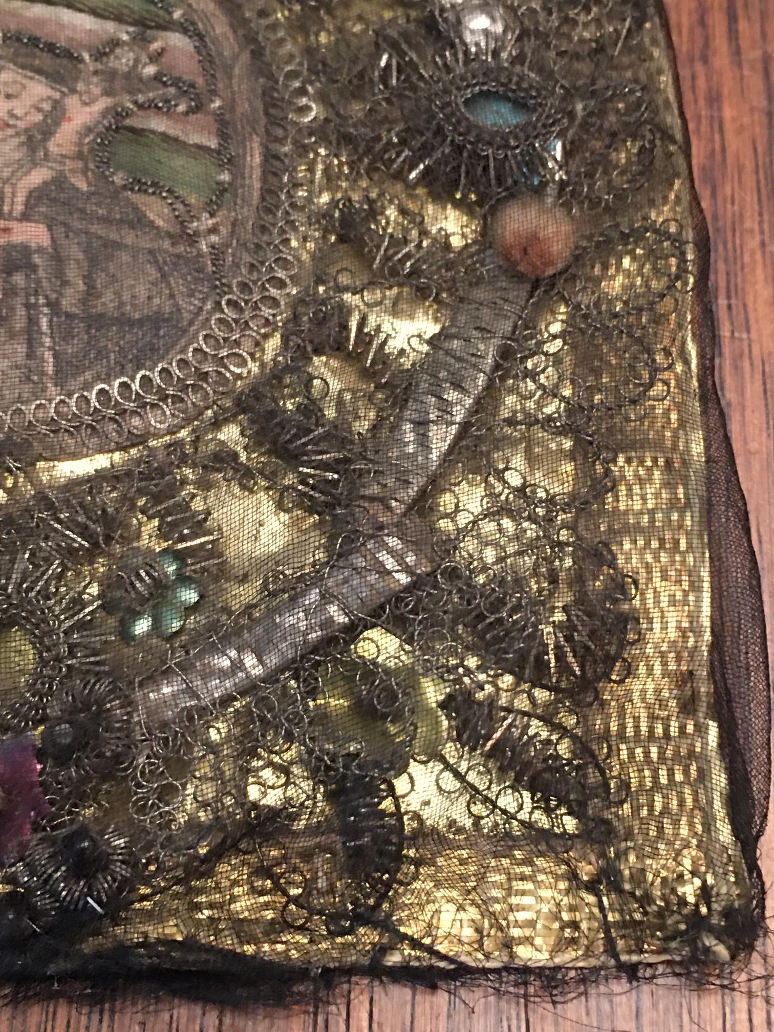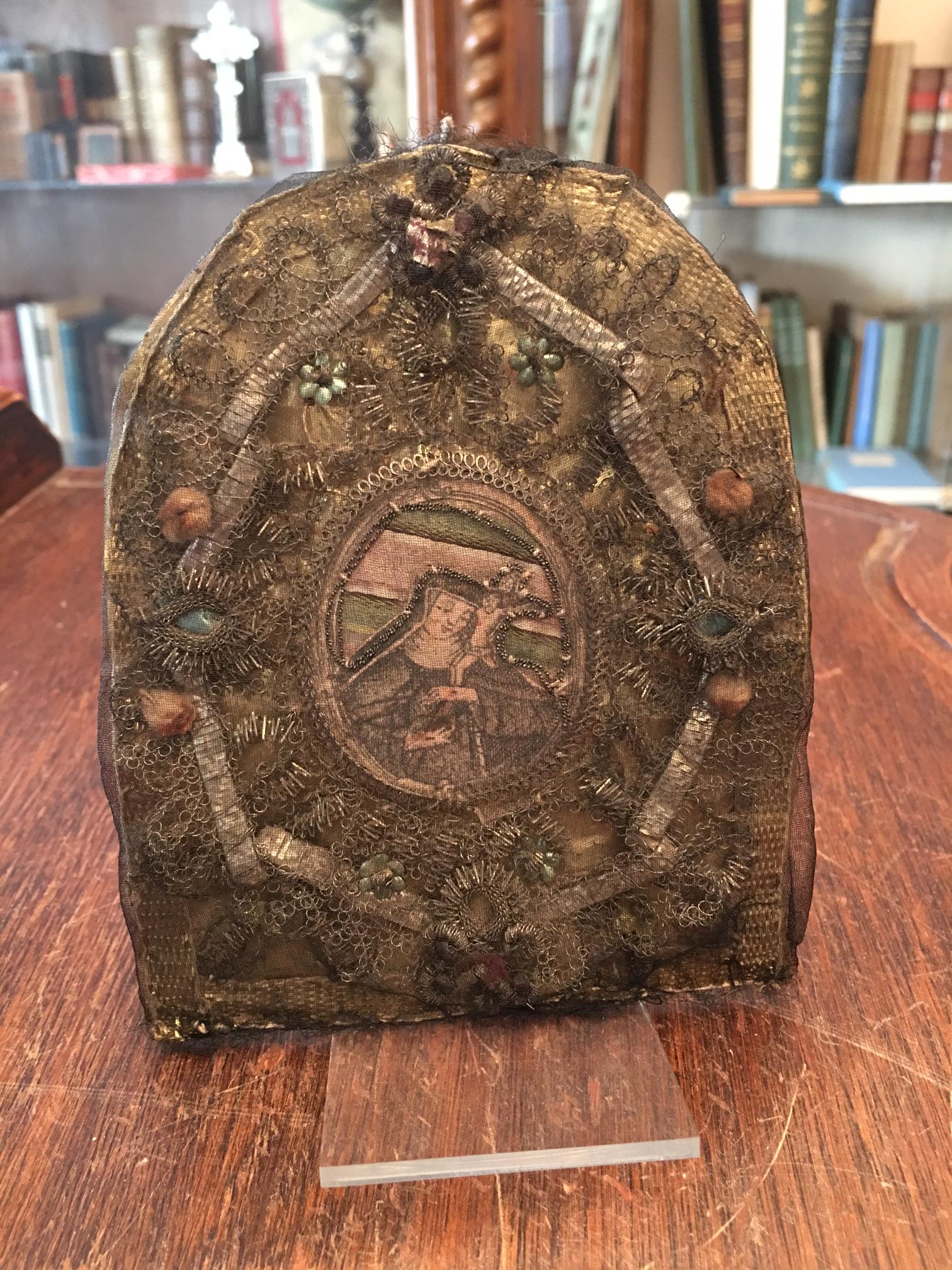 Devotionalien. – Klosterarbeit. – Elisabetha Bona / Achler, Elisabeth (1386-1420). – Klosterarbeit in halbrunder Form : mittig Medaillon mit dem Bildnis der Guten Beth, stigmatisiert ein Kreuz haltend, Gouache auf Papier auf Textilien, umgeben von feinen Drahtarbeiten Schmucksteinen, Granatkugeln, Filz- oder Haarkugeln. Untergrund aus goldener Folie, das Ganze unter schwarzer Gaze.– Kloster Reute, 18./19. Jahrhundert. Masse 13 x 10 cm,