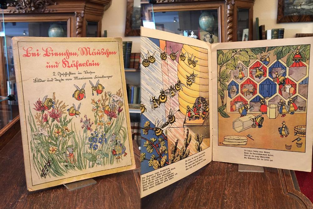 Frimberger, Marianne: Bei Bienchen, Mäuschen und Käferlein : 2 Geschichten in Versen. Bilder und Texte von Marianne Frimberger. Leipzig, Dr. Trenkler Verlag, [1938]. 4° (25x20) [16] S., mit Titel- und 15 ganzseitige farb Illustrationen mit begleitenden Versen, farb ill OKart (Brosch), Ecken etwas bestossen, Rücken unauffällig säurefrei verstärkt, gutes sauberes Exemplar, [= Kinderwelt Serie; Nr. 12 / Verlags-Nr. 1185] Marianne Frimberger (1877-1965) war eine talentierte Wiener Jugendstil-Illustratorin.–