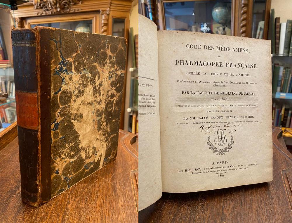 Pharmacopoe / Arzneibuch Frankreich 1819. – Code des Medicamens, ou Pharmacopee Francaise, publiee par ordre de sa Majeste, …, par la Faculte de Medecine de Paris, l’an 1818. Traduite du Latin en Francais par MM. Pavet et la Roche, Docteurs en Medecine, revue et corrigee par MM. Halle, Leroux, Henry et Richard. 1. Aufl., Paris, chez Hacquart, 1819. 4° (25x21), 4 Bl., CXCVI, 373 S., marmor Hldr d.Zt. (HalbFranzband) mit gepräg roten RSchild, Ecken und Stehkanten berieben, vordKante leicht geöffnet, Deckel etwas beschabt, die letzten Blatt mit Wurmgang (minimaler Textverlust), gepflegtes Exemplar mit interessanter Provenienz.– Titelblatt mit zeitgenössischem Namenszug ‚Apotheker Leiner‘.– Vortitelblatt mit Ovalstempel ‚Apotheke Malhaus Constanz‘.— zusätzlich auf Innenspiegel mit Jugendstil-Exlibris von Bruno Leiner, Konstanz.–