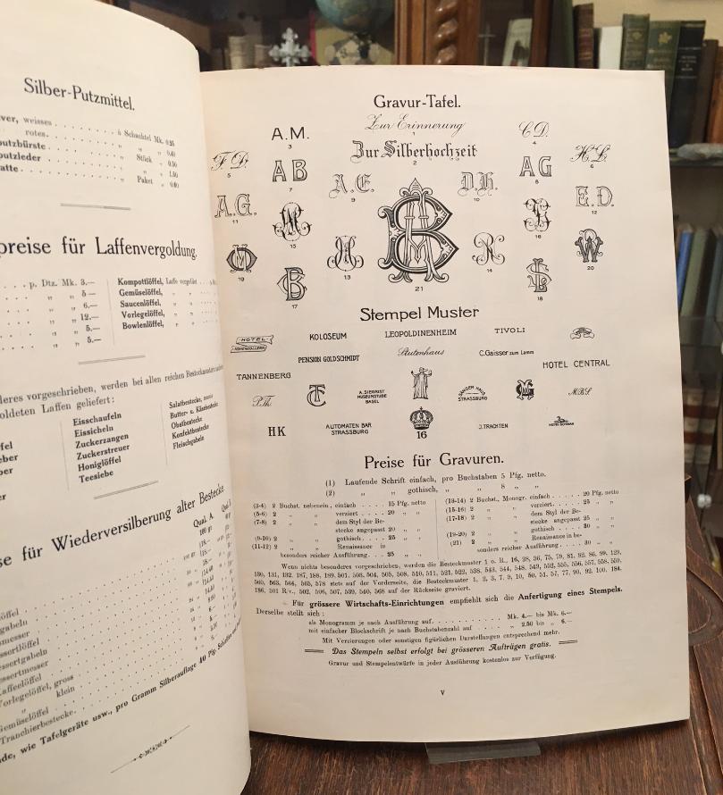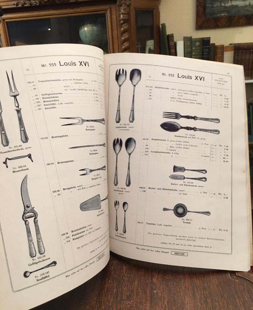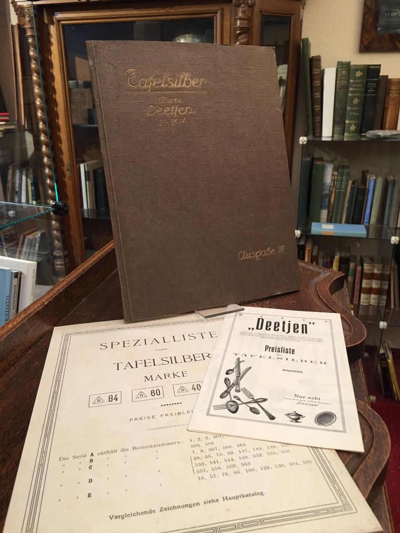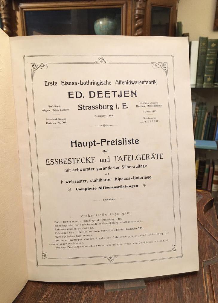 Deetjen, [Edouard], Strassburg i. E., Erste Elsass-Lothringische Alfenidwarenfabrik: Tafelsilber Marke Dettjen : Ausgabe IV : [Katalog] : Haupt-Preisliste über Essbestecke und Tafelgeräte mit schwerster garantierter Silberauflage und Ia weissester, stahlharter Alpacca-Unterlage : Complette Silberausrüstungen. Strassburg, Ed. Deetjen, [um 1900]. 4° (30x23), VIII, 92 S., reich illustriert, mit beiligender Preisliste (8 S. Leporello), brauner OKart (Brosch) mit goldTitel, gering angestaubt, schönes gepflegtes Exemplar, Tafelbestecke, Tafelgeräte, Besteckkästen und Etuis.— dazu: 4seitige Preisliste ‚Spezialliste über Tafelsilber Marke D[eetjen]‘.–