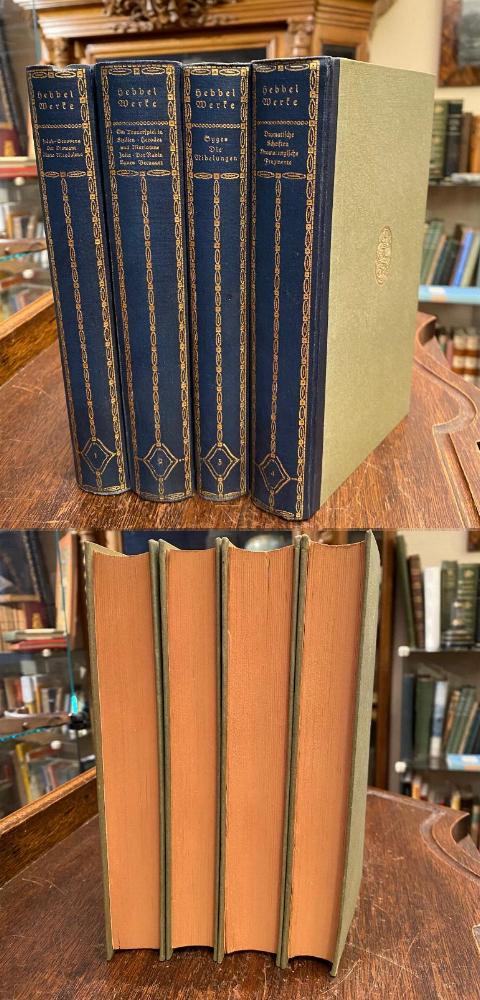 Hebbel, Friedrich (1813-1863). – Buchwald, Reinhard / Zeitler, Julius / Heimann, Moritz / Bab, Julius (Hrsg): Hebbels dramatische Werke in vier Bänden. 4 Bände in 4 (so komplett), Leipzig; Tempel Verlag, [1915]. 8° (20x13), 425; 485; 397; 499 S., einheitl OHln, blauer Leinenrücken mit reicher goldPrägung, dreiseitiger FarbSchnitt, Exlibris auf Innenspiegel, Vorsatz minimal stockfleckig, kaum gelesen, fest sauber und gepflegt, [= Tempel-Klassiker], Bandeinteilung: Band 1: Judith.– Genoveva.– Der Diamant.– Maria Magdalena.– Band 2: Ein Trauerspiel in Sizilien.– Julia.– Herodes und Mariamne.– Der Rubin.– Michelangelo.– Agnes Bernauer.– Band 3: Syges und sein Ring.– Die Nibelungen.– Band 4: Unvollendete Dramen ( Moloch.– Demetrius).– Dramatische Fragmente.– Dramaturgische Konfessionen (Schriften).–