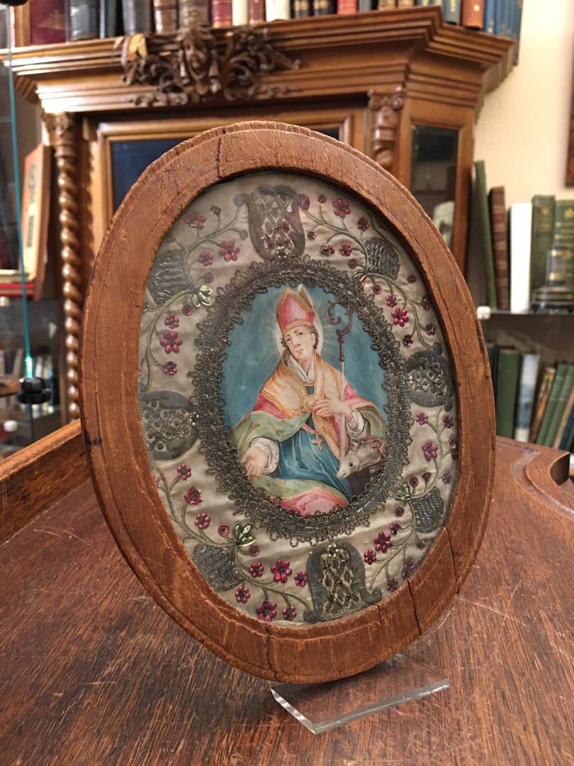 Devotionalien. – Klosterarbeit. – Benno von Meissen (um 1010 – 1106): Klosterarbeit in rundem Eichenrahmen : mittig Bildnis des Hl. Benno, dargestellt als Bischof mit Bischofsstab und Fisch mit Schlüssel, farbige Gouache auf Papier in feinster Qualität, umgeben von feiner Stickerei und Drahtarbeiten mit Goldfäden, Metallplättchen als Blüten auf Textil, das Ganze alt gerahmt unter Glas in ovalem Eichenrahmen. Süddeutsch, um 1750. Masse 20 x 16 cm,