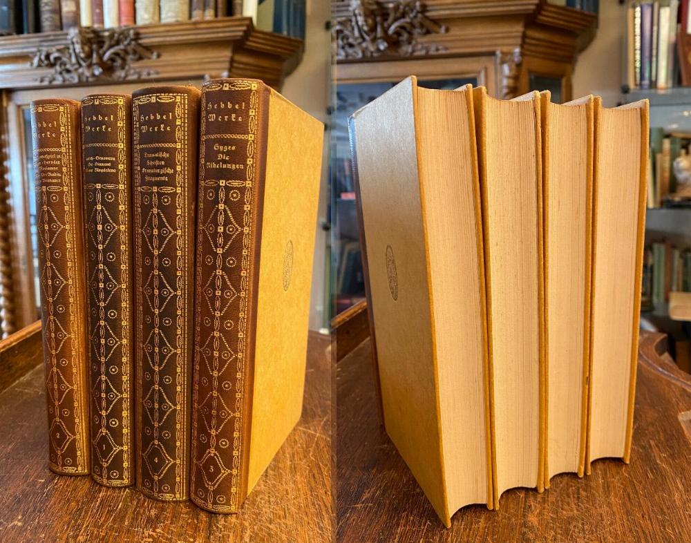 Hebbel, Friedrich (1813-1863). – Buchwald, Reinhard / Zeitler, Julius / Heimann, Moritz / Bab, Julius (Hrsg): Hebbels dramatische Werke in vier Bänden. 4 Bände in 4 (so komplett), Leipzig; Tempel Verlag, [1915]. 8° (20x13), 425; 485; 397; 499 S., einheitl braune OHldr mit reicher goldPrägung, Rücken aufgehellt, kaum gelesen, fest sauber und gepflegt, [= Tempel-Klassiker], Bandeinteilung: Band 1: Judith.– Genoveva.– Der Diamant.– Maria Magdalena.– Band 2: Ein Trauerspiel in Sizilien.– Julia.– Herodes und Mariamne.– Der Rubin.– Michelangelo.– Agnes Bernauer.– Band 3: Syges und sein Ring.– Die Nibelungen.– Band 4: Unvollendete Dramen ( Moloch.– Demetrius).– Dramatische Fragmente.– Dramaturgische Konfessionen (Schriften).–