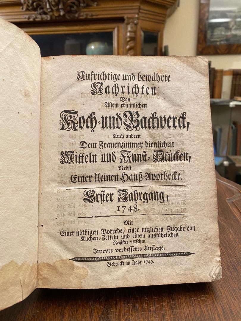 Aufrichtige und bewährte Nachrichten von Allem ersinnlichen Koch- und Backwerck, Auch andern Dem Frauenzimmer dienlichen Mitteln und Kunst-Stücken, Nebst einer kleinen Hauß-Apothecke – Erster Jahrgang, 1748. Mit Einer nöthigen Vorrede, einer nuzlichen Zugabe von Kuchen-Zetteln und einem ausführlichen Register versehen. Zweyte verbesserte Auflage. 2., verbesserte Aufl., 1. Jg. (von 2), Stuttgart, Johann Georg Dörr, 1749. 8° (21x17), 3 Bl., 442 S. [recte 406 i.e. 404 : Paginierung springt 287 auf 290, 441/442 falsch nummeriert] [so komplett], Hldr d.Zt., Einband stärker bestossen und mit Spuren des Alters, Bezugsfehlstelle, vordEcke stark gebraucht, innen nur vereinzelt wenig randig, gutes sauberes und festes Exemplar, [VD18 90207548.– Weiss, Gastronomia; 185.– Horn/Arndt, 221.– Georg, 302.– Kiefer, Sammlung Dittmar; 758].— Die erste nachweisbare kulinarische Wochenschrift, enthält fast ausschließlich Kochrezepte.– erschienen in 52 Einzelnummern. (Druckvermerk: ’Diese Blätter sind alle Monntage zu haben bey dem Hochfürstl. Wirttemb. Posthalter Johann Georg Dörr in Stuttgardt).– Die beiden erschienenen Jahrgänge bilden ein komplettes Kochbuch, das dann 1753 als ‚Neues wohleingerichtetes Kochbuch, aus mehr als 1500 Speisen … bestehend‘ erschien.—