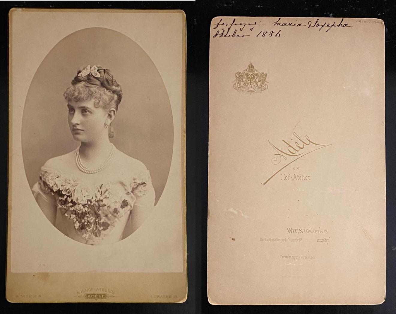 Maria Josepha von Sachsen Erzherzogin von Österreich (1867–1944). – Grossformatige Porträtfotografie der 19-jährigen Prinzessin und späteren Mutter des letzten Kaisers von Österreichs im Oval mit Perlenkette und blumendekorierten Kleid : Albuminabzug auf Karton, dieser abgeschrägt, gerundet und vergoldet. Karton am unteren Rand und rückseitig bezeichnet K. K. Hof-Atelier Adele, Wien, Graben 19, sowie rückseitig handschriftlich bezeichnet ‚Erzherzogin Maria Josepha / Oktober 1886‘. Wien, Atelier Adele, 1886. (20 x 13 auf 22.3 x 13.7), Ecken etwas berieben, gutes Exemplar,