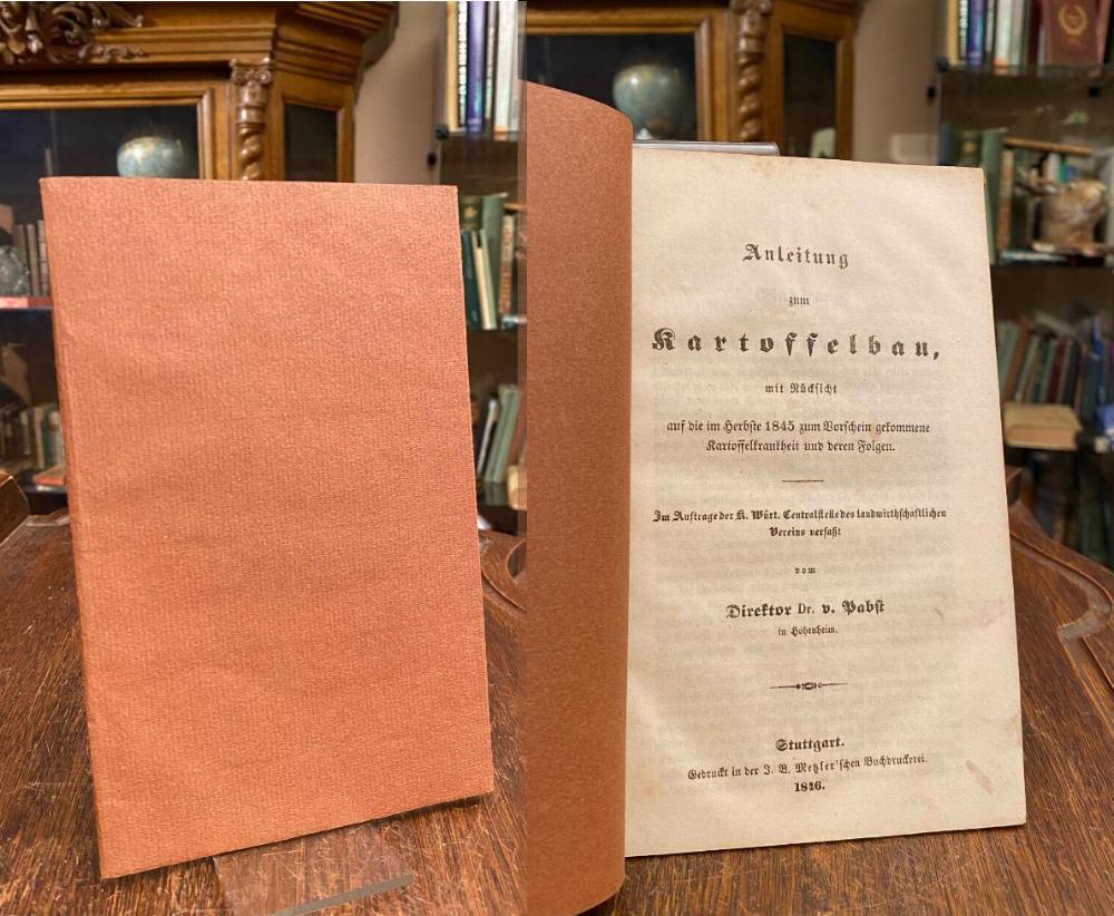 Pabst, [Heinrich Wilhelm von] (Hohenheim): Anleitung zum Kartoffelbau, mit Rücksicht auf die im Herbste 1845 zum Vorschein gekommene Kartoffelkrankheit und deren Folgen. Stuttgart, gedruckt in der J.B. Metzler’schen Buchdruckerei, 1846. 8° (20x12), 32 S., schlichte Kart (Bütten-Brosch), Titel minimal fleckig, fest sauber und gepflegt, ohne Register gebunden.–